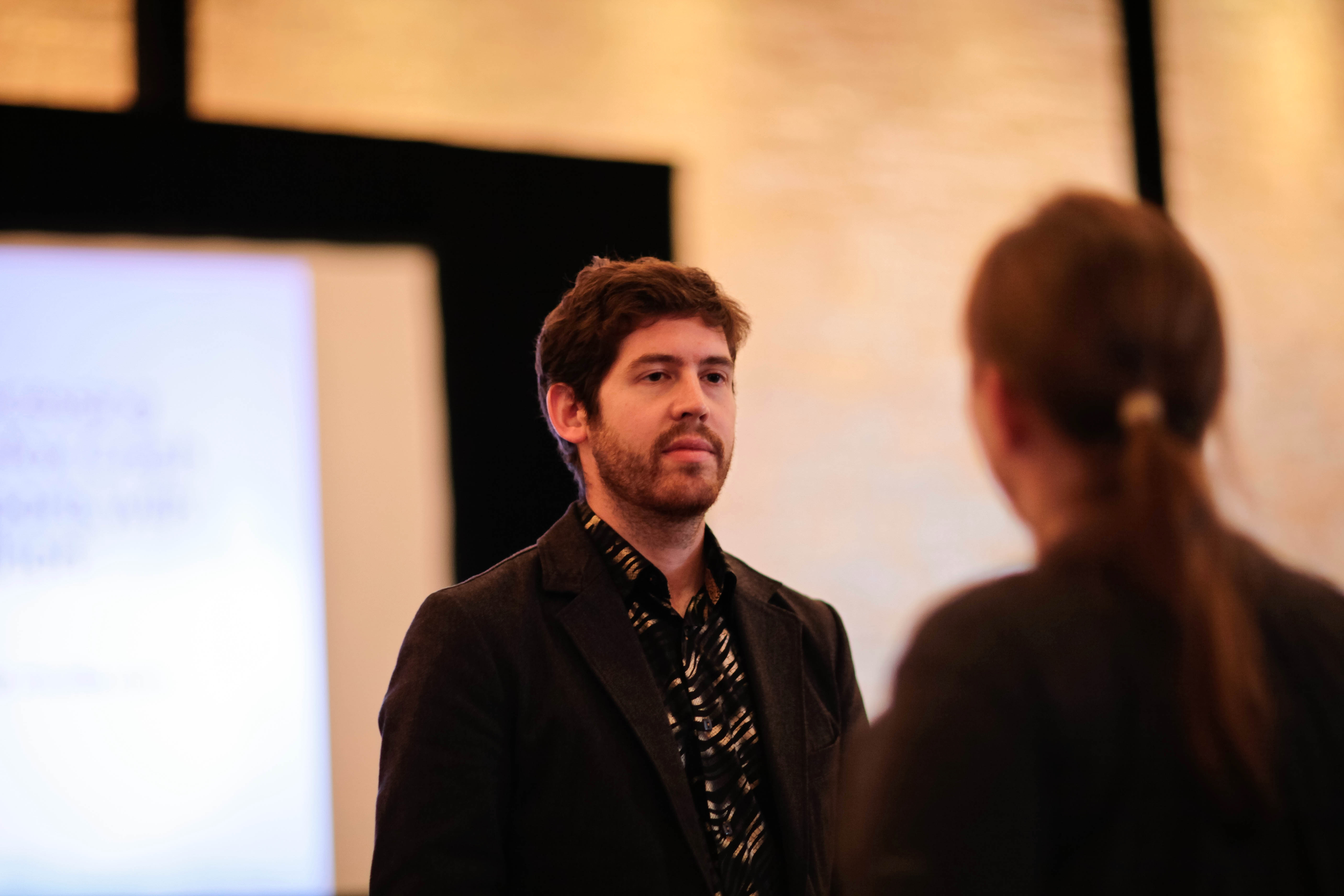 The photograph captures a moment of engagement between two individuals, with one person in focus while the other remains partially obscured. Soft, diffused lighting creates a warm ambiance, enhancing the reflective mood of their conversation. The contrasting dark background emphasizes their expressions, inviting curiosity about their dialogue.