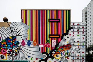 This vibrant mural bursts with color and energy, showcasing whimsical fish against a backdrop of bold, striped patterns. The playful composition is balanced by graphic elements, while the lighting enhances the bright hues, creating an inviting and lively atmosphere. A mix of playful motifs invites curiosity, making it a dynamic centerpiece in an urban environment.