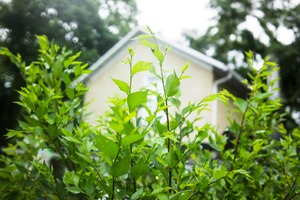 In this photograph, vibrant green foliage frames a softly blurred house in the background, creating a sense of natural intimacy. The diffuse daylight enhances the freshness of the leaves, lending an uplifting and serene mood to the scene. The composition invites the viewer to explore the peaceful coexistence of human habitation and nature.