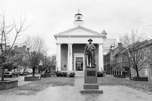 In this somber black-and-white photograph, a statue of a soldier stands resolute in front of an imposing historic building. The overcast sky casts a muted light, enhancing the stark contrast and evoking a contemplative mood, while the bare trees and empty walkways create an air of quiet reflection. The composition draws the eye toward the statue, symbolizing strength and remembrance against a backdrop of architectural history.
