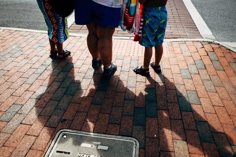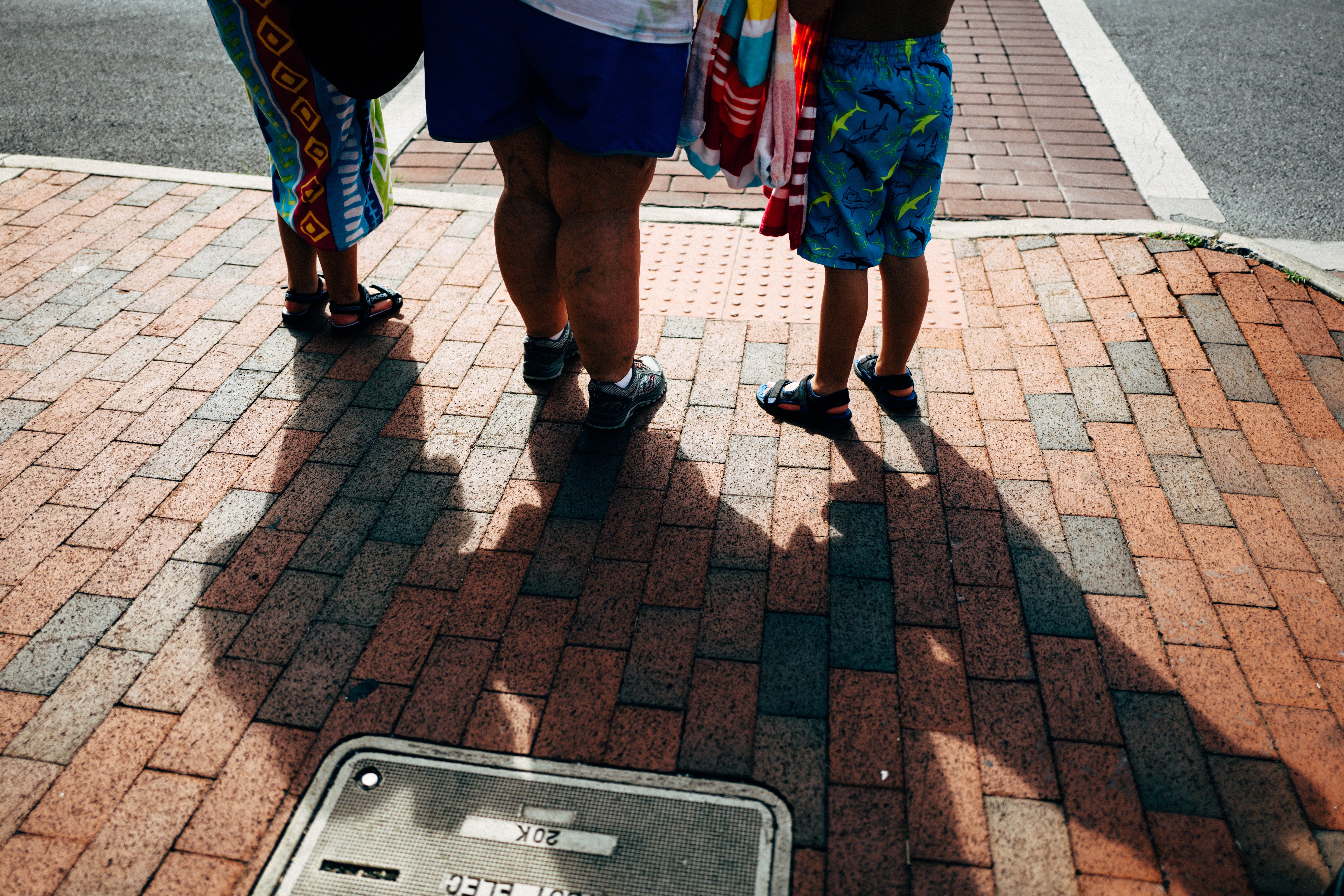 Three pairs of legs stand at the intersection, basked in warm sunlight. The vibrant colors of their beach attire contrast with the textured brick pavement, creating a lively yet relaxed atmosphere. Long shadows stretch outwards, hinting at stories of summer days and shared moments in the sun.
