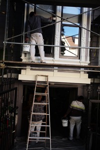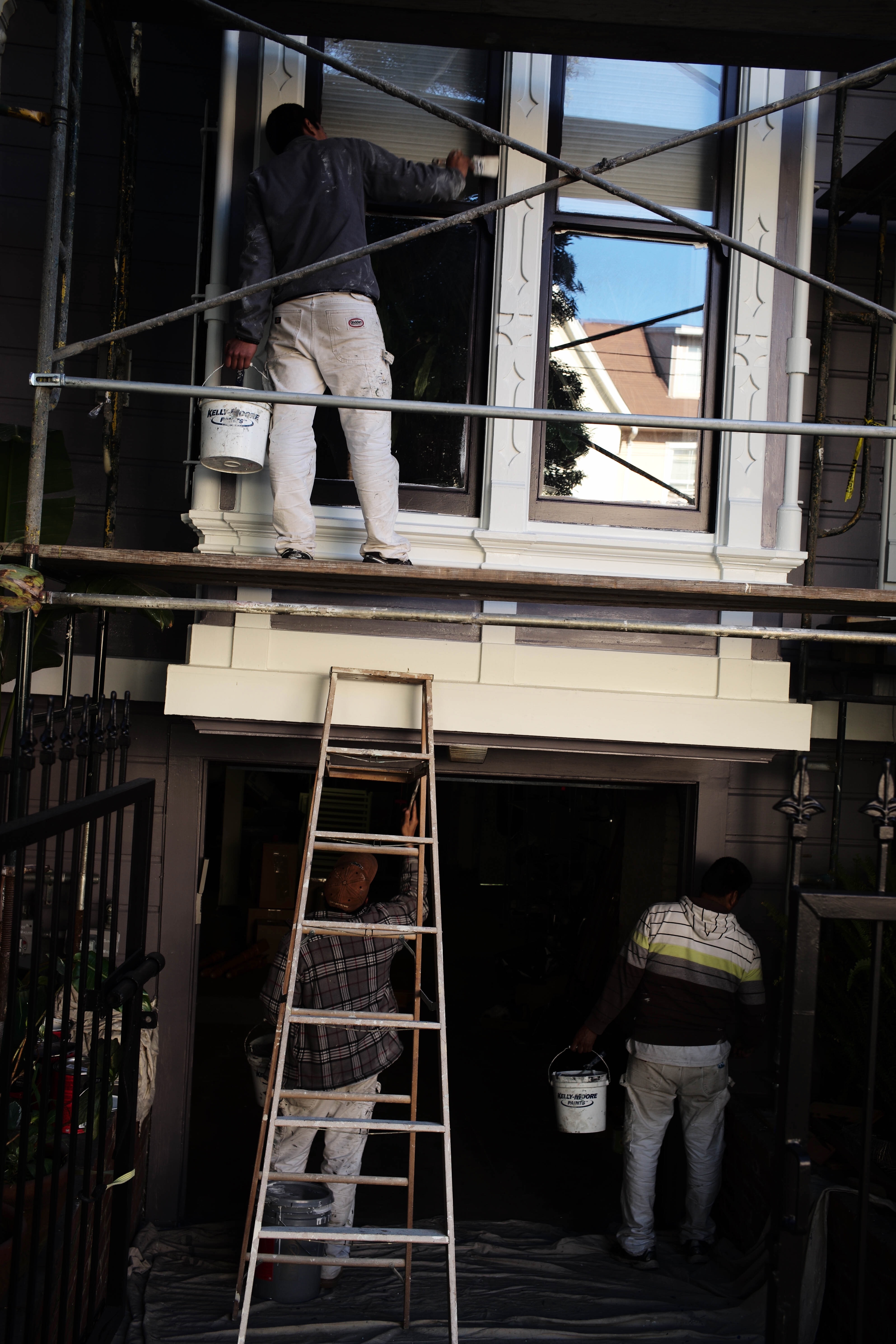 The photograph captures three workers engrossed in painting a house's exterior, with one on scaffolding meticulously applying paint to a window frame. The interplay of natural light creates a warm, focused atmosphere, highlighting their dedication and teamwork. The contrasts between shadows and highlights add depth, emphasizing the labor and care that goes into home improvement.
