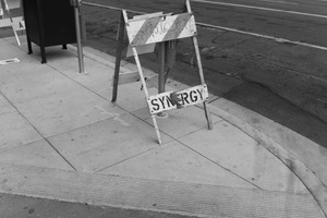 In this black-and-white photograph, a weathered A-frame sign stands alone on the sidewalk, its painted word 'SYNERGY' partially obscured and surrounded by graffiti. The composition captures a moment of urban neglect, contrasting the faded message with the sharp lines of the pavement and road. Soft, diffused lighting enhances the mood of solitude and introspection, inviting viewers to reflect on the story behind the sign.