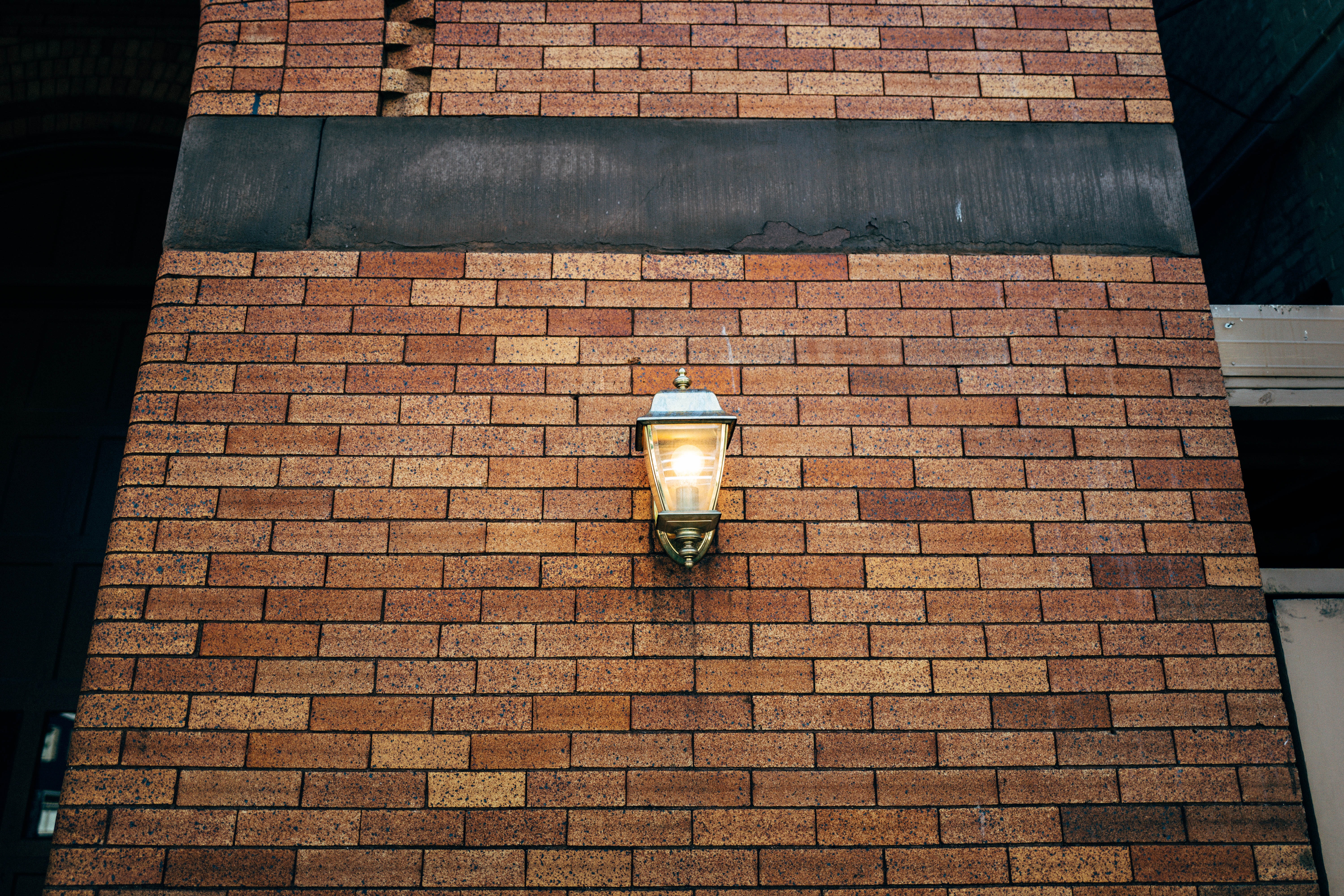 A solitary lamp glows gently against a rustic brick wall, casting a warm light that contrasts with the cool tones of the surrounding shadows. The composition emphasizes the lamp's vintage design, drawing the viewer's eye to its soft illumination, which adds a touch of nostalgia and tranquility to the scene. The mood evokes a sense of quiet reflection, inviting contemplation in an otherwise stark environment.