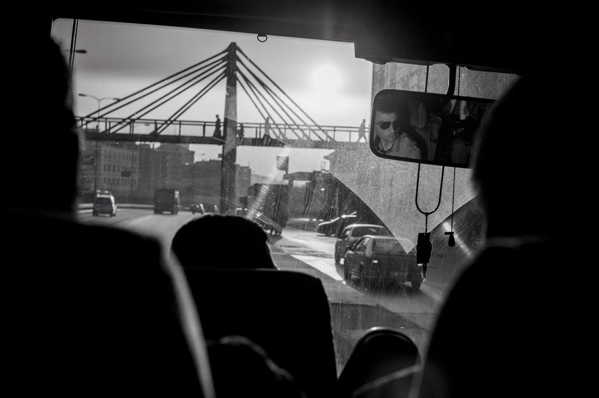 This black-and-white photograph captures a moment inside a bus, framed by shadows of passengers as they gaze out at a silhouetted bridge. The soft glow of the setting sun reflects against the dirty glass, creating a nostalgic and contemplative atmosphere. The composition draws the eye towards the bridge while hinting at the lives within the bus, evoking a sense of reflection on both the journey and the scenery.