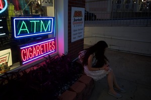 The photograph captures a moment of stillness amidst vibrant neon signs advertising 'ATM' and 'Cigarettes.' A young woman sits forlornly on a brick ledge, her silhouette merging with the shadows, as the colorful lights cast a surreal glow around her. The composition juxtaposes the lively neon hues against her contemplative demeanor, creating a mood of introspective solitude in an otherwise bustling environment.