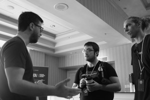In a softly lit room, three individuals engage in an animated discussion, marked by expressive gestures and intent expressions. The monochrome tones heighten the mood of focus and contemplation, drawing attention to the dynamics of their interaction. Their casual attire and relaxed setting suggest a social yet purposeful gathering, fostering a sense of connectivity among them.
