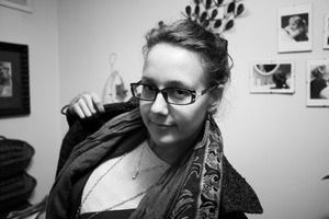 In this black-and-white portrait, a young woman poses with a contemplative smile, her glasses adding a touch of sophistication. The soft lighting and subtle textures of her layered clothing create a warm yet intimate atmosphere. Background elements like framed photos hint at a personal and creative space, enriching the overall mood of quiet reflection.