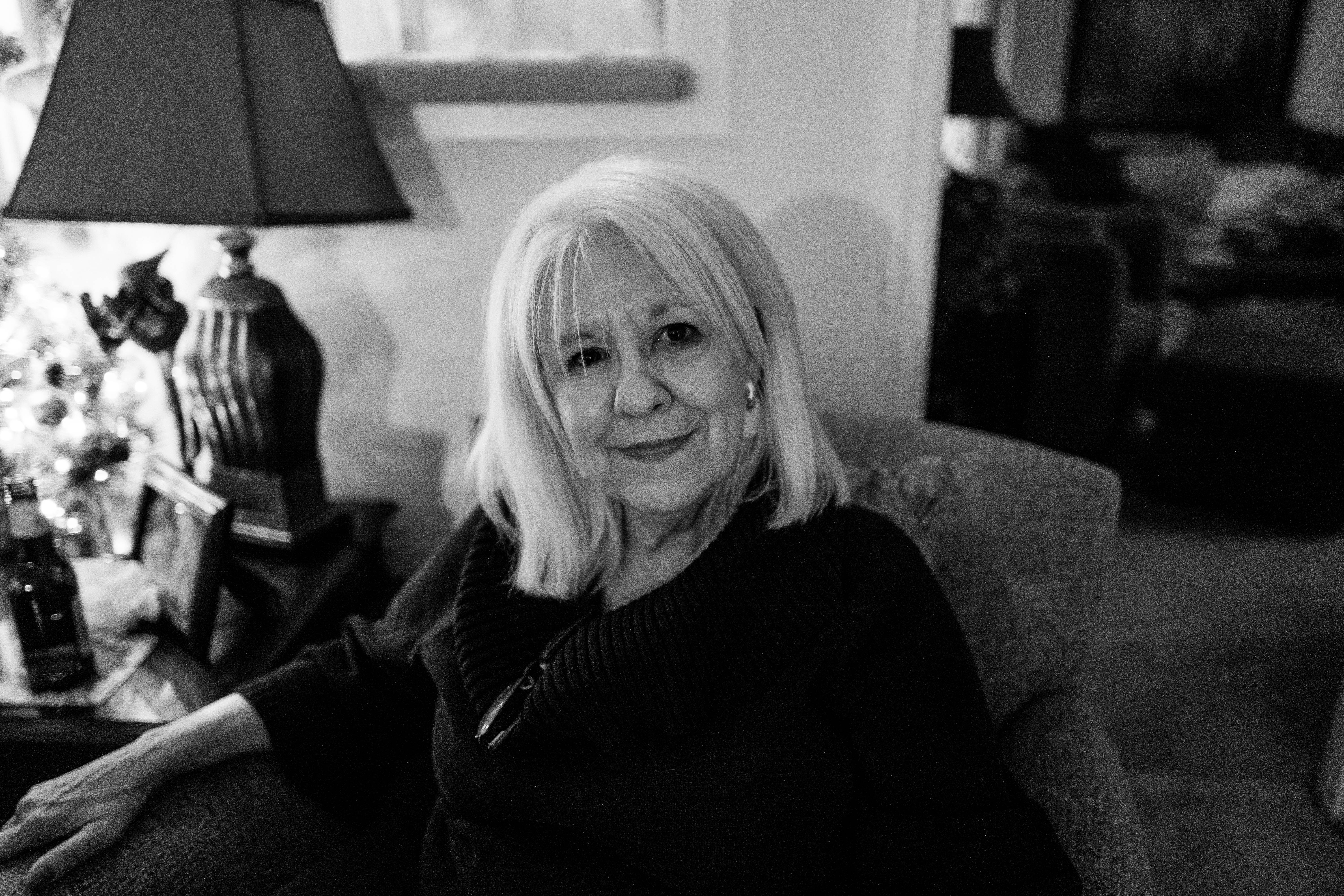This intimate black-and-white portrait features an older woman seated comfortably, exuding warmth and wisdom. Soft, warm lighting accentuates her gentle smile, creating a serene atmosphere that invites connection. The background hints at a cozy, lived-in space, enhancing the photograph's sense of nostalgia and comfort.