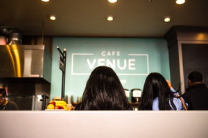 In a cozy cafe setting, two patrons with long, dark hair sit side by side, their backs turned toward the viewer. The soft, ambient lighting creates a warm, inviting atmosphere, while the turquoise wall emblazoned with 'CAFE VENUE' adds a modern touch to the composition. The scene captures a moment of quiet anticipation, suggesting a shared experience in a communal space.