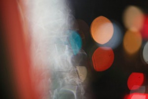 This photograph captures a dreamy blend of bokeh, where vivid blobs of colored light emerge against a blurred background. The soft lighting creates an ethereal mood, evoking a sense of mystery and solitude in the urban night. The composition, rich in texture and color, invites the viewer to linger and contemplate the transient beauty of city life.