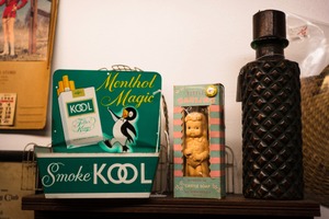 This photograph captures a charming arrangement of vintage items, including a bright green Kool cigarette display, a whimsical soap dish featuring a cherubic figure, and an intricately designed bottle. The soft, warm lighting enhances the nostalgic mood, inviting viewers to reflect on a bygone era. The composition balances playful colors and textures, creating an inviting vignette of retro decor.