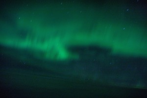 This photograph captures the ethereal glow of the aurora borealis, dominated by vibrant green hues that dance across the dark night sky. The blurred effect adds to the dreamlike quality, evoking a sense of wonder and tranquility. Stars twinkle faintly in the background, enhancing the mystical atmosphere of this celestial spectacle.