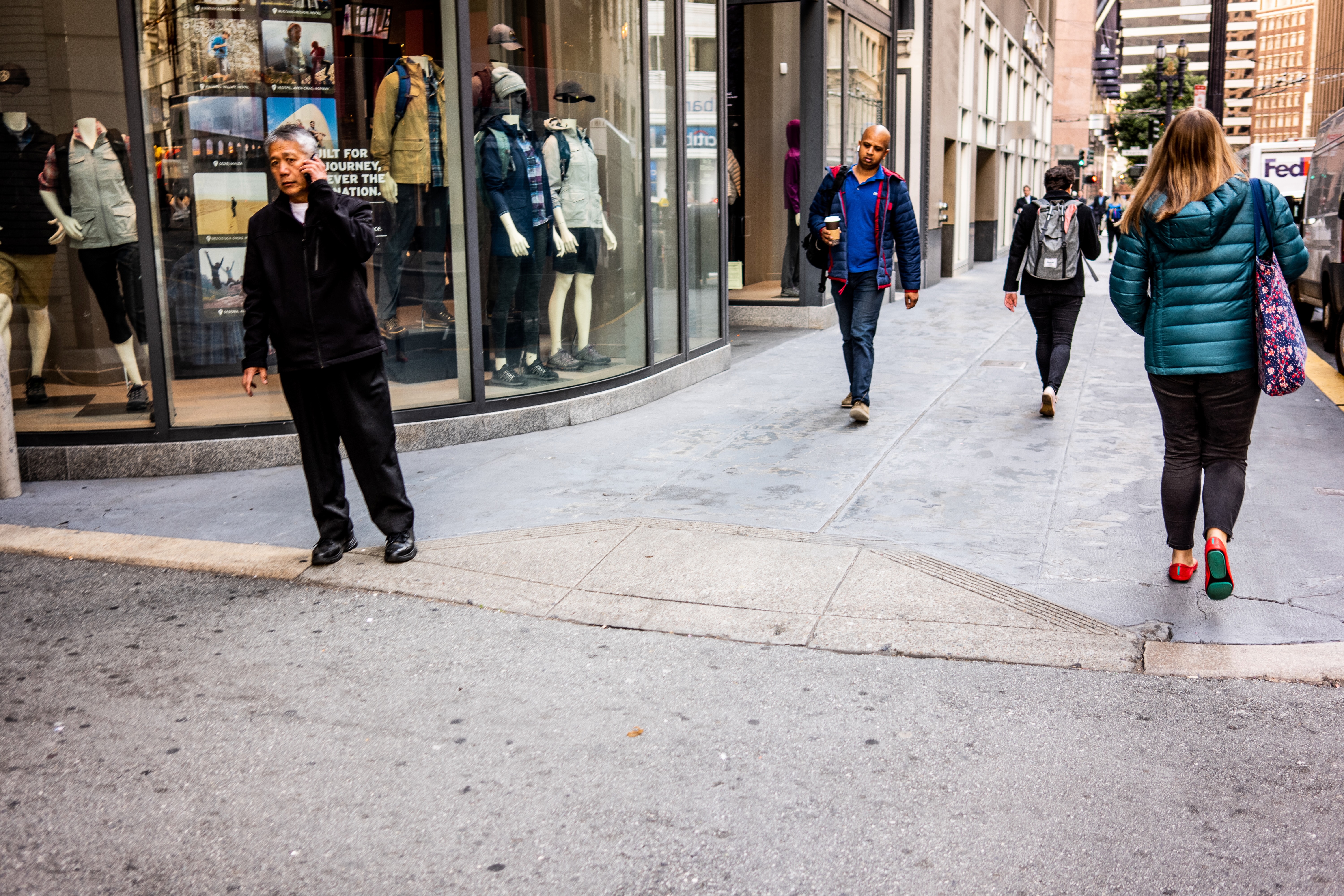 A dynamic city corner captures a moment of everyday life, featuring pedestrians moving purposefully past storefronts. The lighting is soft, adding a serene yet bustling atmosphere, while the composition creates a sense of layered depth with figures at varying distances. The juxtaposition of the man on the phone and the people walking by adds a narrative of connection and isolation within the urban environment.