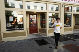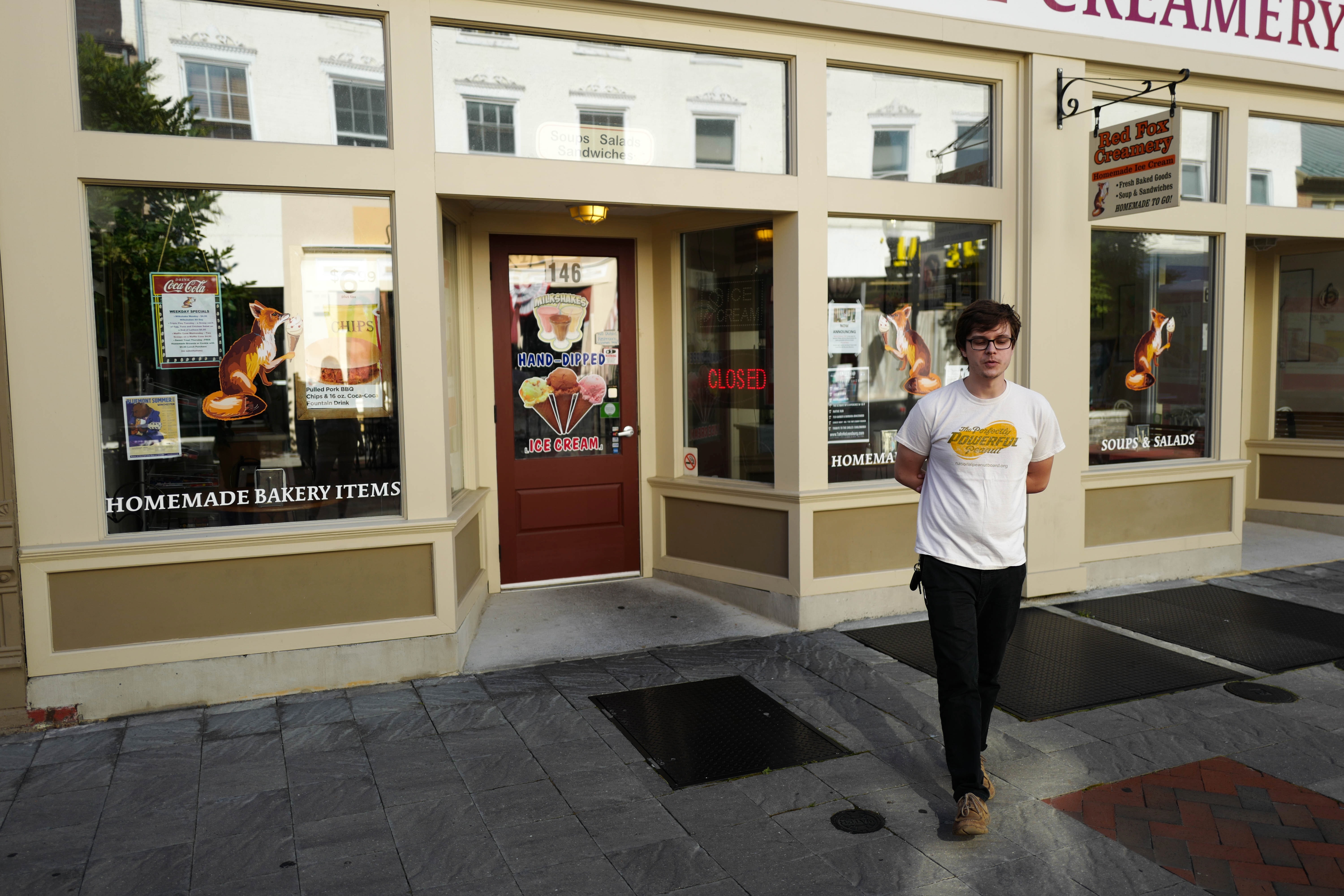 In front of a quaint creamery, a young man stands casually, embodying a moment of stillness amidst a bustling environment. Soft, warm lighting highlights the storefront's inviting colors and the mixed signage hints at a lively yet somber atmosphere, as the 'CLOSED' sign prominently displays the shop's current status. The composition balances the subject with the charming architecture, creating a juxtaposition of youthful energy and a nostalgic small-town vibe.