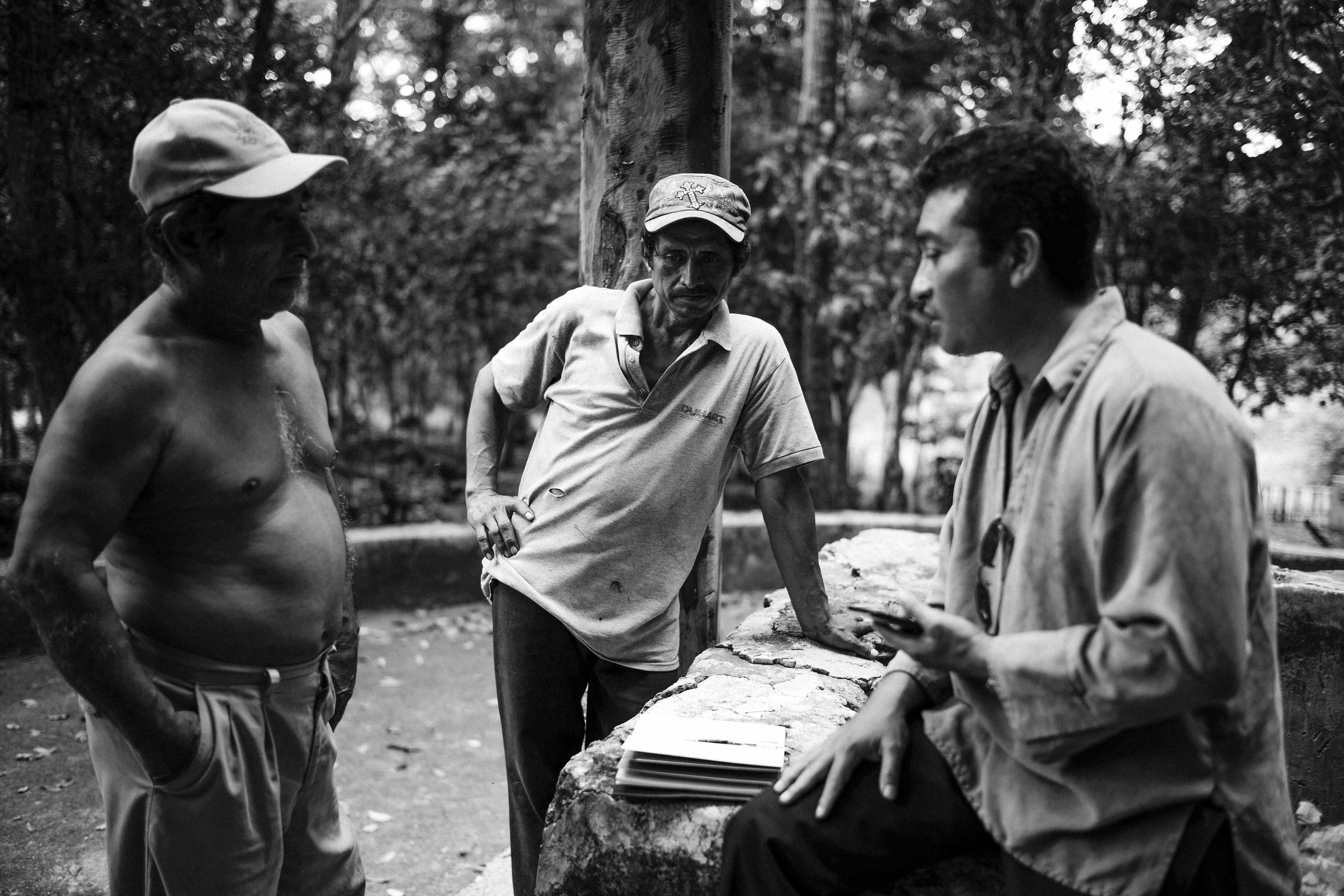 The photograph captures a moment of intimate dialogue among three men in a park, surrounded by a lush, blurred backdrop of trees. The soft, diffused light highlights their expressions, revealing a mix of contemplation and camaraderie, while the black and white tones lend a timeless quality to the scene. Positioned naturally at varying distances from each other, the men create a dynamic composition that invites the viewer to ponder their conversation and connection.