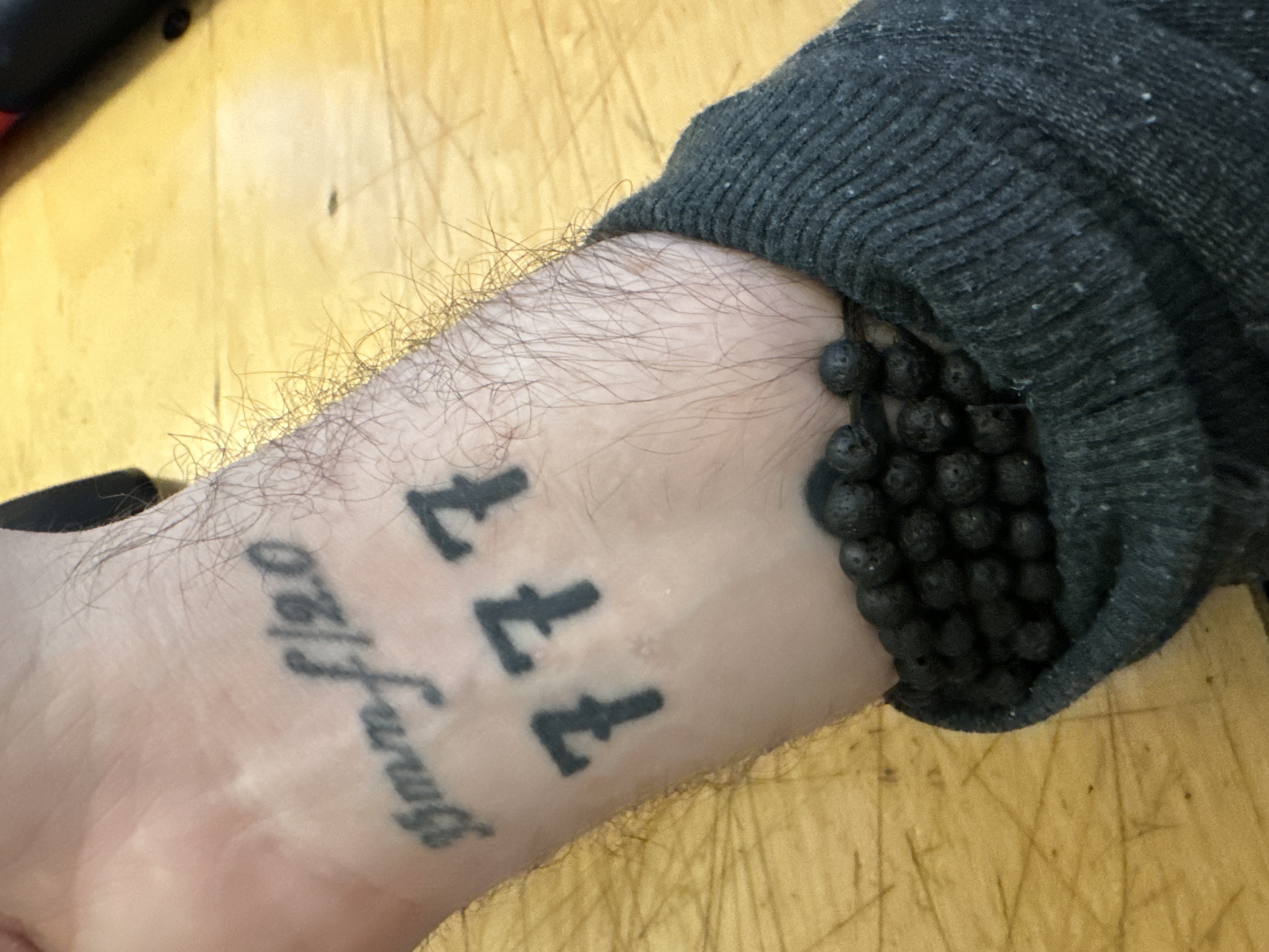 A close-up of a wrist reveals a tattoo bearing the numbers '777' and '35mm f/20,' merging elements of photography and numerology. The warm, natural lighting casts soft shadows, enhancing the texture of the skin and ink while the dark beaded bracelet adds contrast. The composition feels personal and introspective, inviting viewers to ponder the significance behind the chosen symbols.