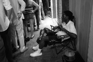 In a dimly lit alley, a lone drummer sits on a folding chair, lost in the rhythm of his craft. The contrast of his white shirt against the dark surroundings adds to the intimate vibe, while the blurred figures of onlookers create a sense of anticipation and energy. The monochrome setting evokes a nostalgic mood, emphasizing the passion and spirit of street performance.