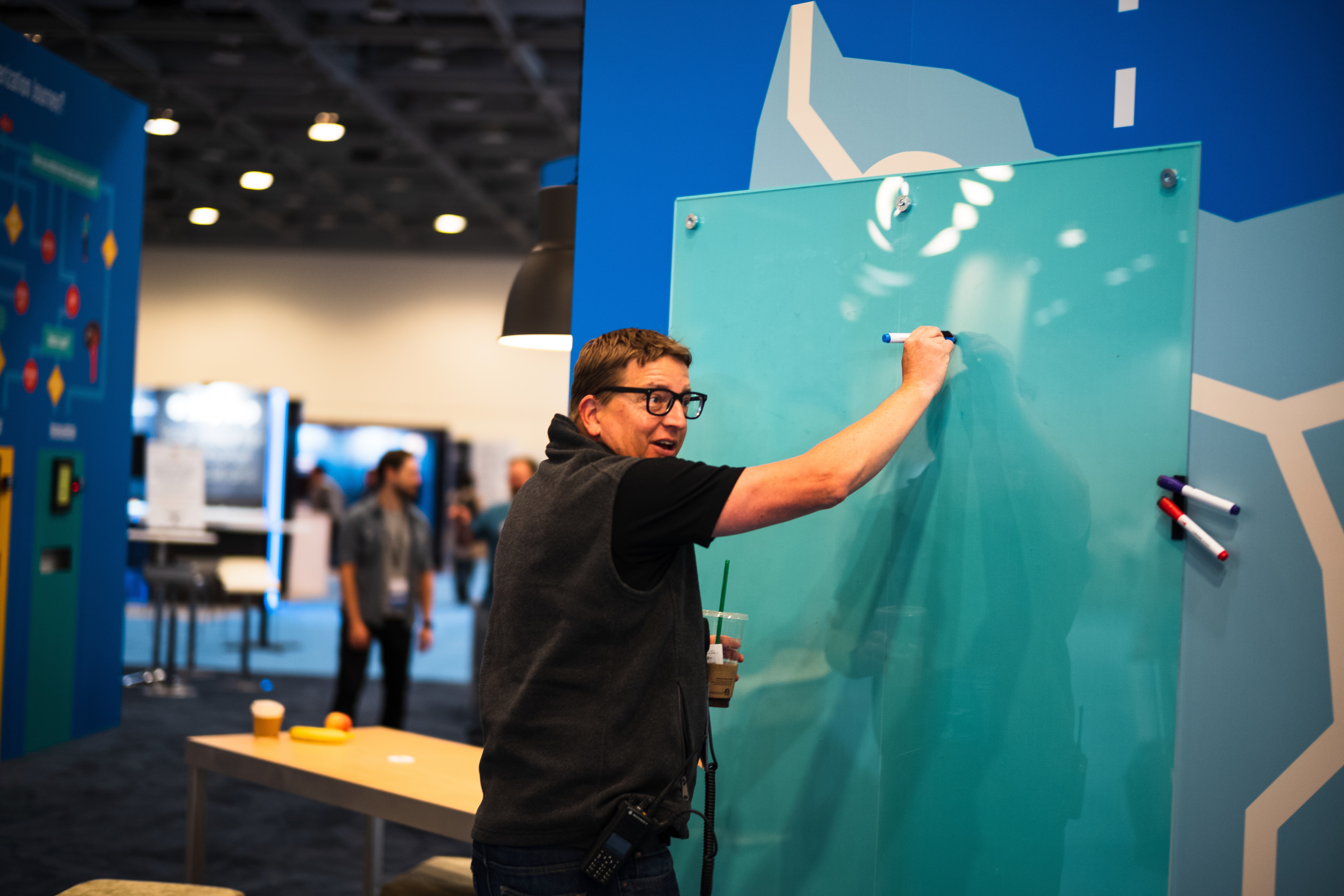 In a vibrant conference setting, a man enthusiastically writes on a glass board, embodying the spirit of collaboration and innovation. The ambient lighting casts a warm glow, enhancing the engaging atmosphere while blue and green hues add a modern touch. His focused expression contrasts with the soft blur of background figures, illustrating a moment of inspiration amidst a dynamic environment.