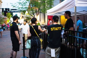 The photograph captures a lively scene in Old Town Winchester during a bustling evening event. Staff members, dressed in black with 'STAFF' emblazoned on their shirts, interact with each other amidst a backdrop of festival-goers and colorful lights, creating an atmosphere of camaraderie and excitement. The warm, golden lighting enhances the inviting mood, making it feel both energetic and welcoming.