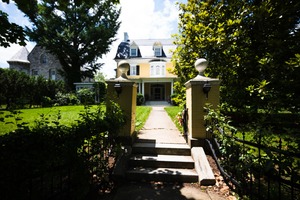 A serene path leads towards a stately yellow house, framed by lush greenery and soft shadows. The bright sunlight dances on the steps, inviting visitors to explore the peaceful surroundings. The composition captures a perfect blend of natural beauty and architectural charm, evoking a sense of nostalgia and tranquility.