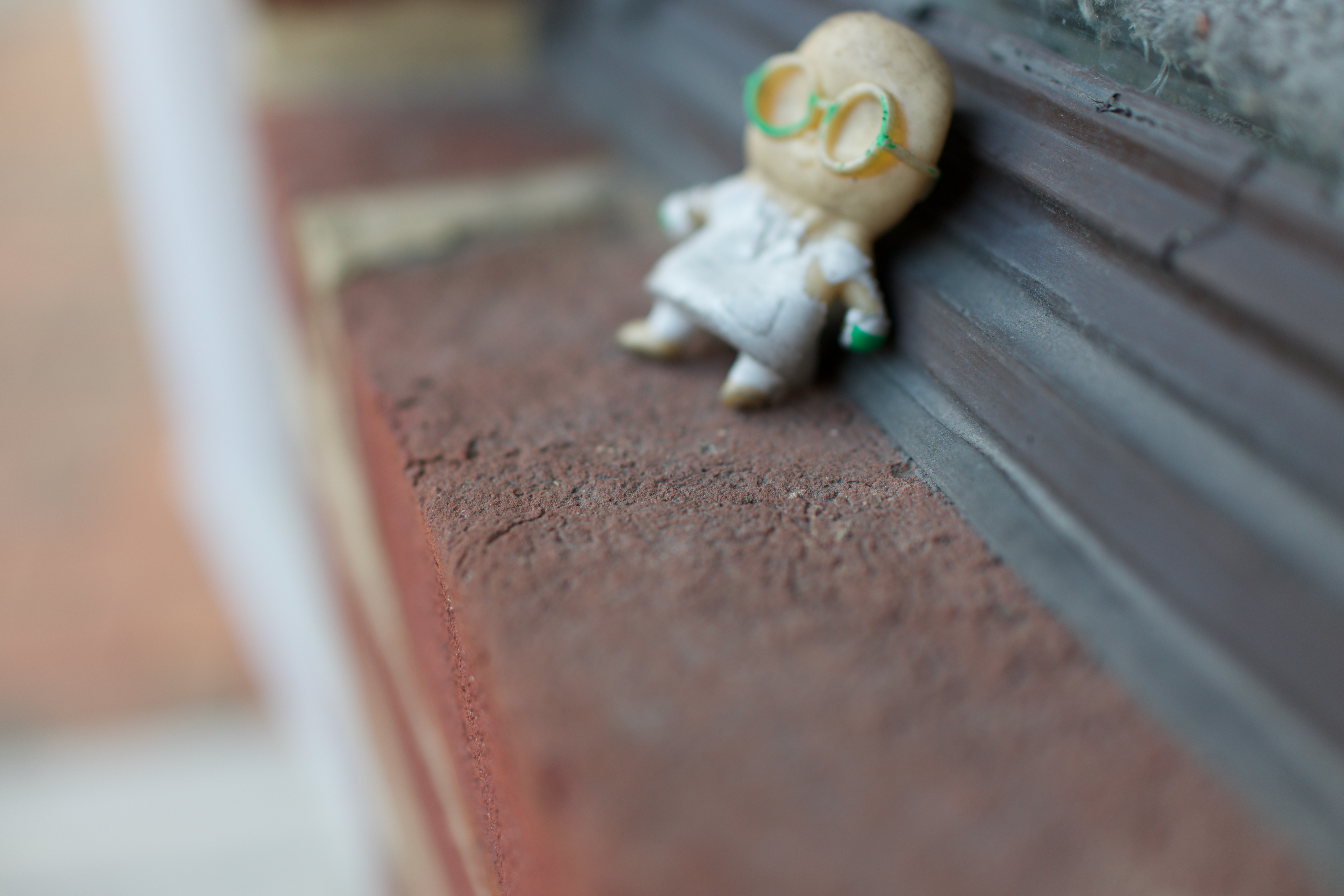 A small, whimsical figure sits forlornly on a brick ledge, evoking a sense of nostalgia and loneliness. Soft natural light highlights its quirky glasses and white attire, contrasting with the warm, textured surface of the bricks. The shallow depth of field draws attention to the figure, creating an intimate yet melancholic mood as it gazes wistfully into the distance.