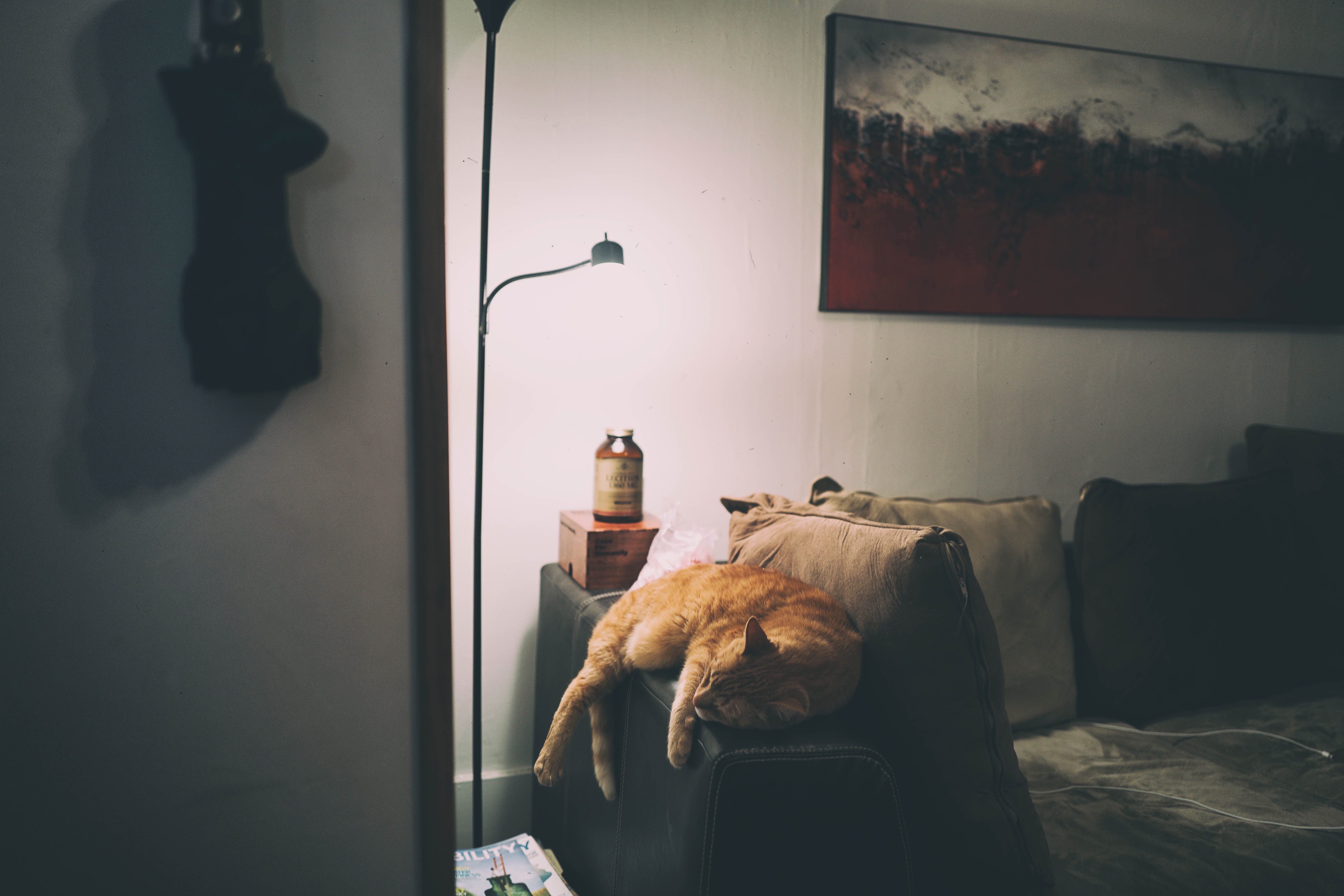 A relaxed orange cat sprawls across the arm of a couch, embodying a sense of tranquility in a softly lit room. The warm glow from a nearby lamp casts gentle shadows, enhancing the intimate atmosphere. A hint of abstract art on the wall adds a touch of character to the cozy, lived-in space.
