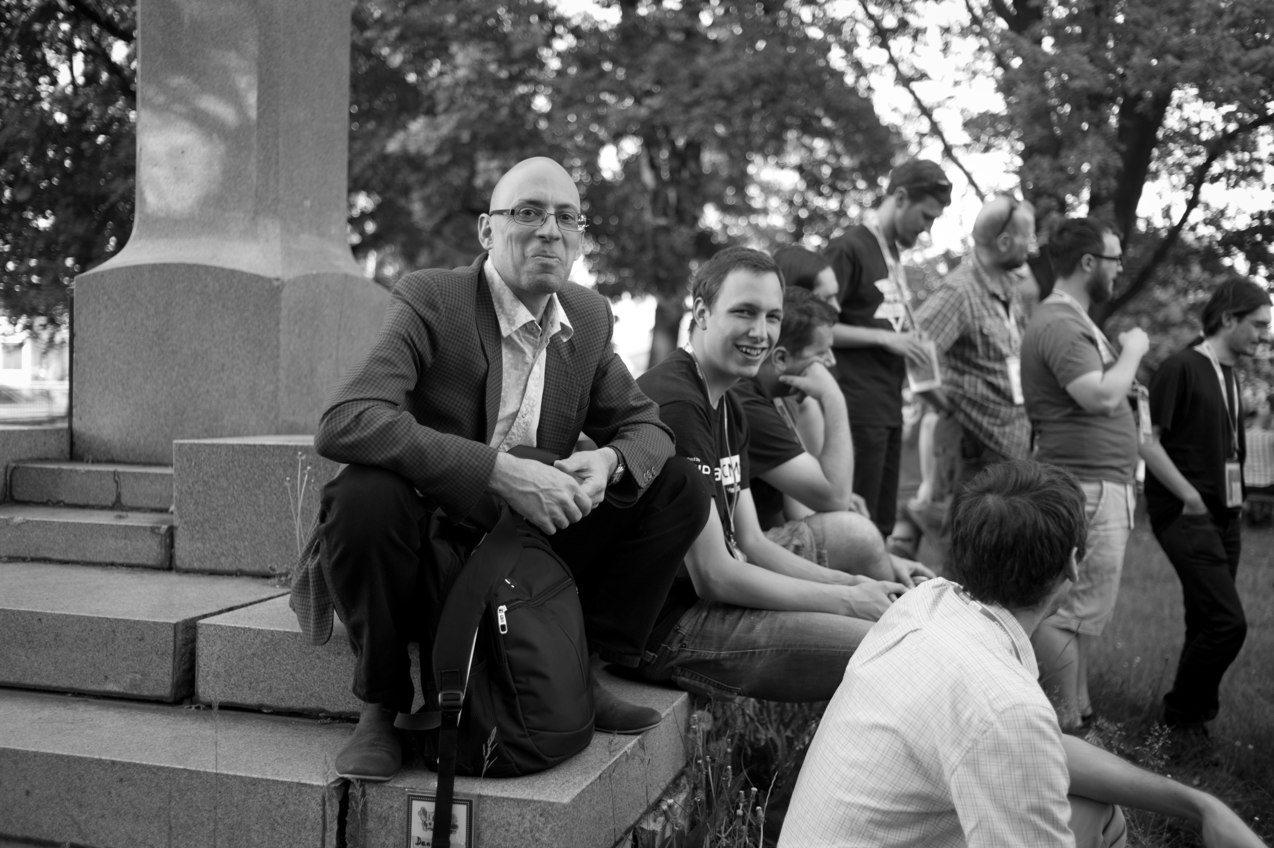In this black-and-white photograph, a man in a suit sits pensively on a stone pedestal, contrasting with a lively group of people around him. The composition captures a moment of reflection amidst the vibrant energy of the gathering, with soft natural light filtering through the trees, creating a peaceful yet dynamic atmosphere. The expressions of the surrounding figures hint at conversation and camaraderie, emphasizing a blend of individuality and community.