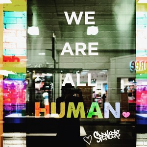 This photograph captures a storefront window displaying a powerful message: 'WE ARE ALL HUMAN,' rendered in vibrant, multicolored letters. The reflective surface creates a layered effect, intertwining the text with the colorful chaos of the surroundings, evoking a sense of inclusivity and unity. The lighting is soft yet dynamic, enhancing the message's warmth and inviting the viewer to contemplate their shared humanity.