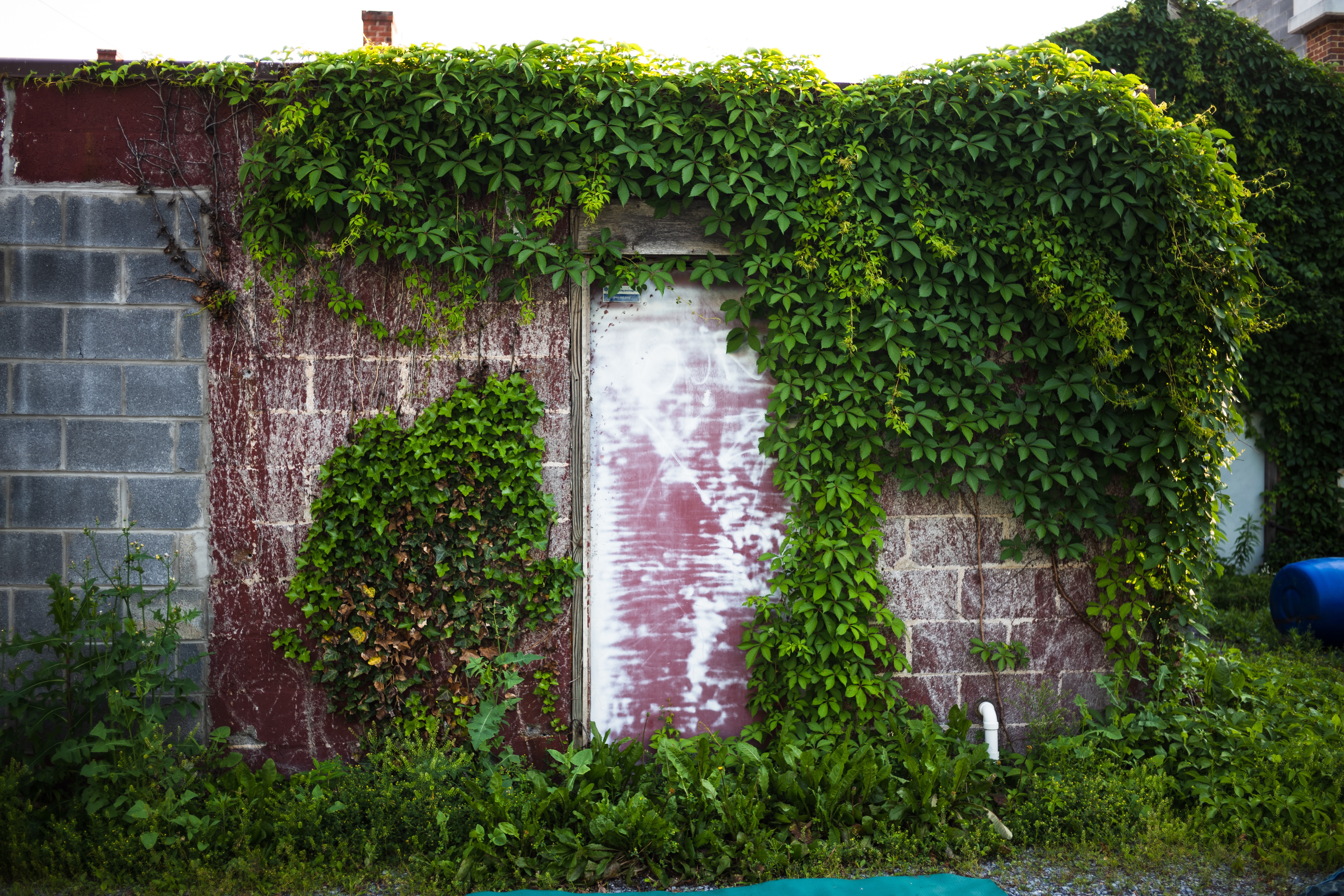 This photograph showcases a rustic wall partially concealed by lush green ivy, creating a contrast between nature and decay. The diffused sunlight casts a gentle glow, enhancing the textures of the peeling paint and the vibrant greenery. The overall mood is one of quiet abandonment, evoking a sense of nostalgia for forgotten spaces reclaimed by nature.