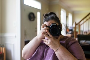 In a serene, softly lit room, a woman points a camera toward the viewer, enveloping the scene in an intimate and inviting atmosphere. The gentle light streaming through the windows highlights her focused expression, while the blurred background hints at a comfortable home environment. This composition conveys a moment of connection between the subject and the viewer, blending curiosity with a sense of playfulness.
