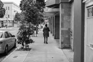In this monochrome photograph, a solitary figure walks down an empty sidewalk, evoking a sense of introspection amid urban solitude. The composition captures the distance between the subject and the surrounding environment, with a row of trees and parked cars framing the scene. Soft, diffused lighting enhances the mood of quiet reflection, creating a poignant moment in a bustling urban landscape.