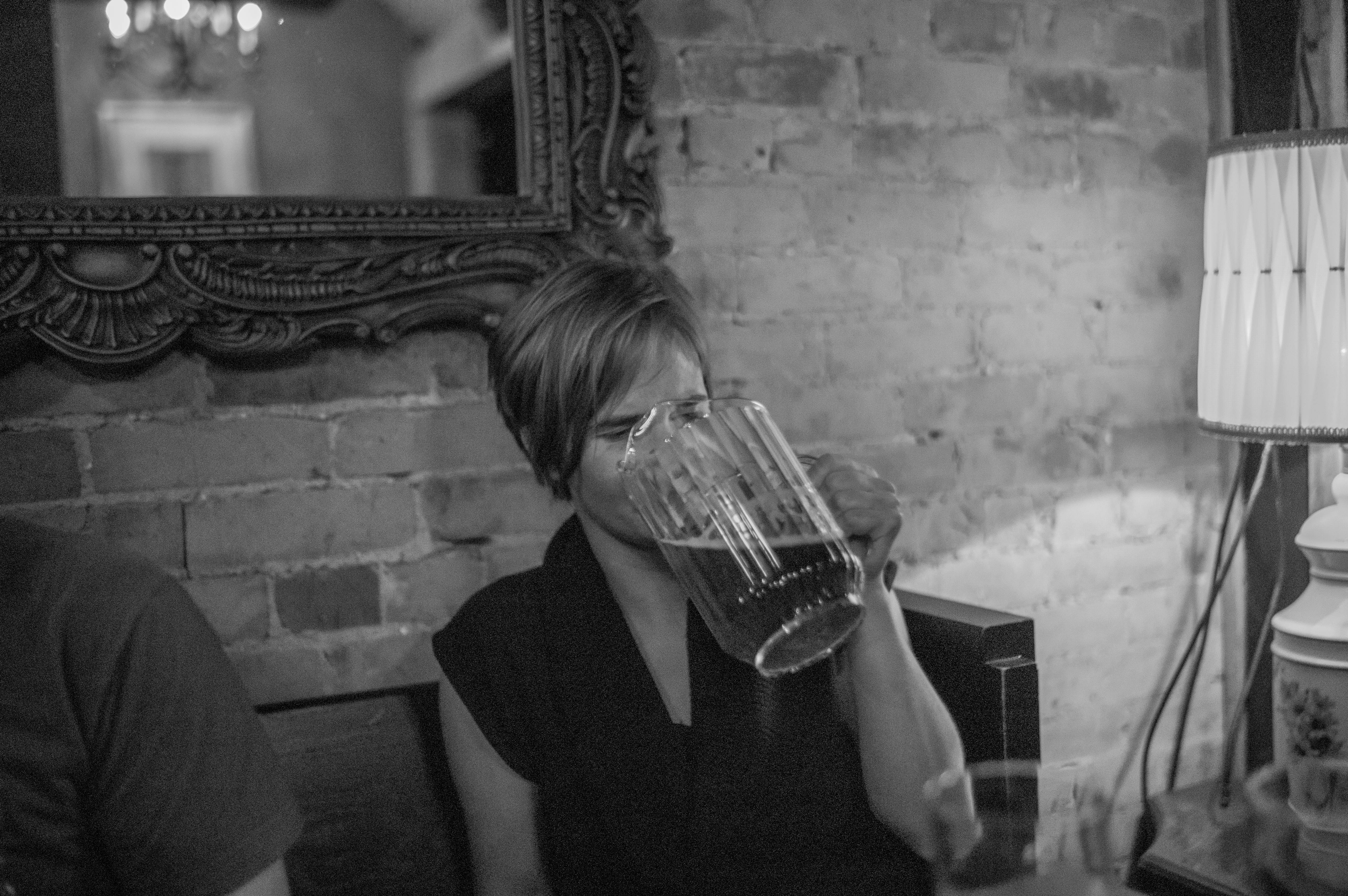 In a cozy, dimly-lit bar, a woman drinks from a large pitcher, her focus captured in a moment of sheer enjoyment. The rustic brick backdrop and soft lighting create a nostalgic atmosphere, highlighting the casual intimacy of the scene. Reflections in the mirror add depth, enhancing the sense of camaraderie and warmth within the space.