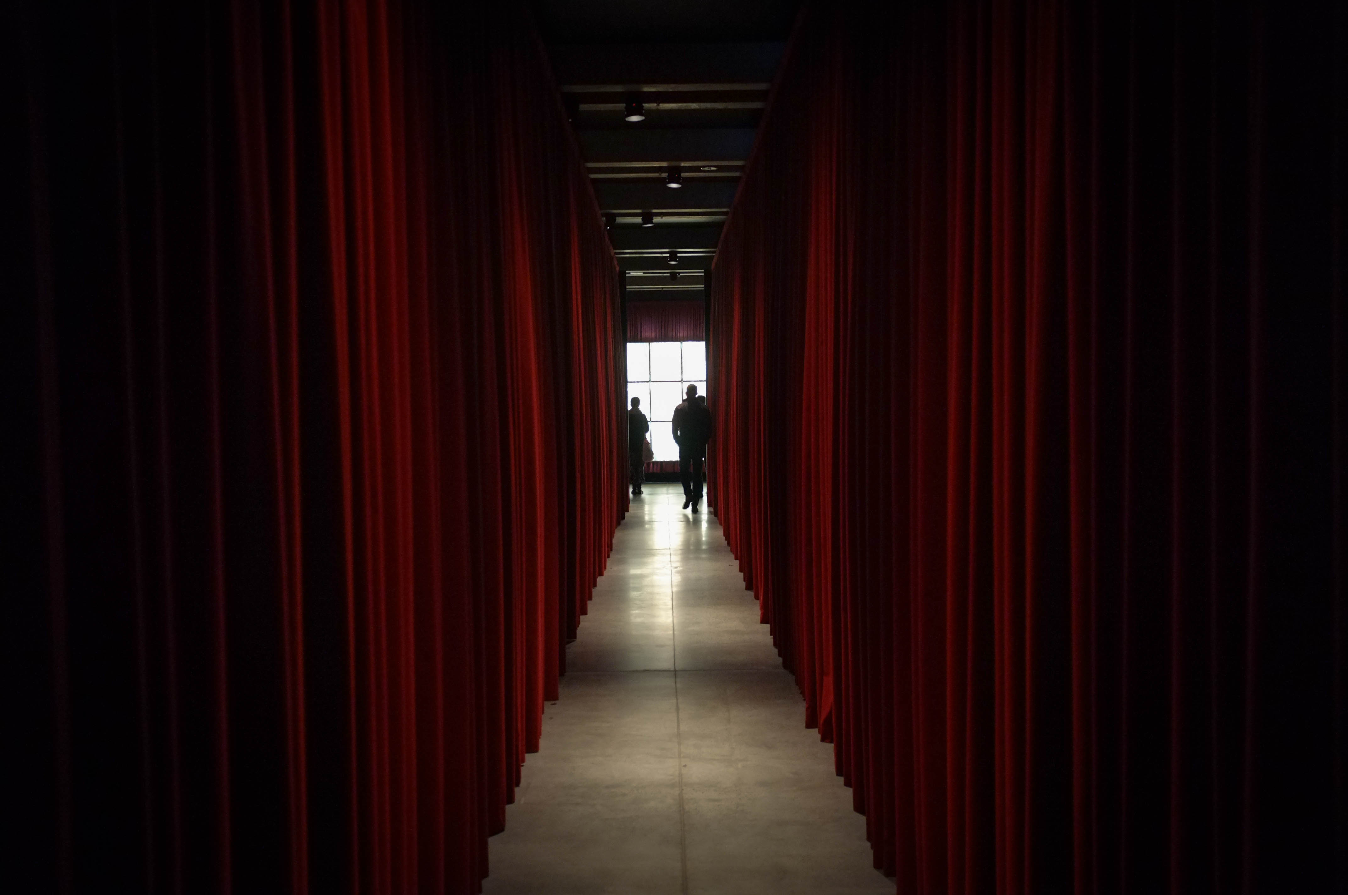 A narrow corridor draped in deep red curtains leads the viewer's gaze toward two silhouetted figures standing in front of a bright window. The contrast between the rich warmth of the curtains and the cool, muted tones of the concrete floor creates a moody, almost theatrical atmosphere. This composition hints at mystery and invites contemplation, as shadows and light interplay along the path ahead.