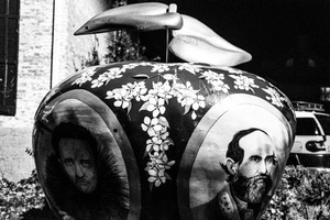 This striking black-and-white photograph features a large apple sculpture adorned with floral motifs and portraits of historical figures. The scene is illuminated by soft lighting, casting dramatic shadows that enhance the texture of the apple's surface. The night setting creates a contemplative mood, inviting viewers to ponder the stories behind the artwork and its significance.