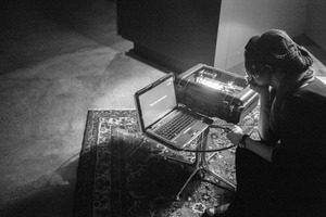 A figure sits solemnly beside a laptop displaying a stark message in a dimly lit room, enveloped in shadows that enhance the mood of introspection. The intricate patterns of a vintage rug contrast with the mechanical elements of the equipment, creating a blend of warmth and technological coldness. This scene evokes a sense of solitude and contemplation, as the subject appears deep in thought amidst the flickering glow of the screen.