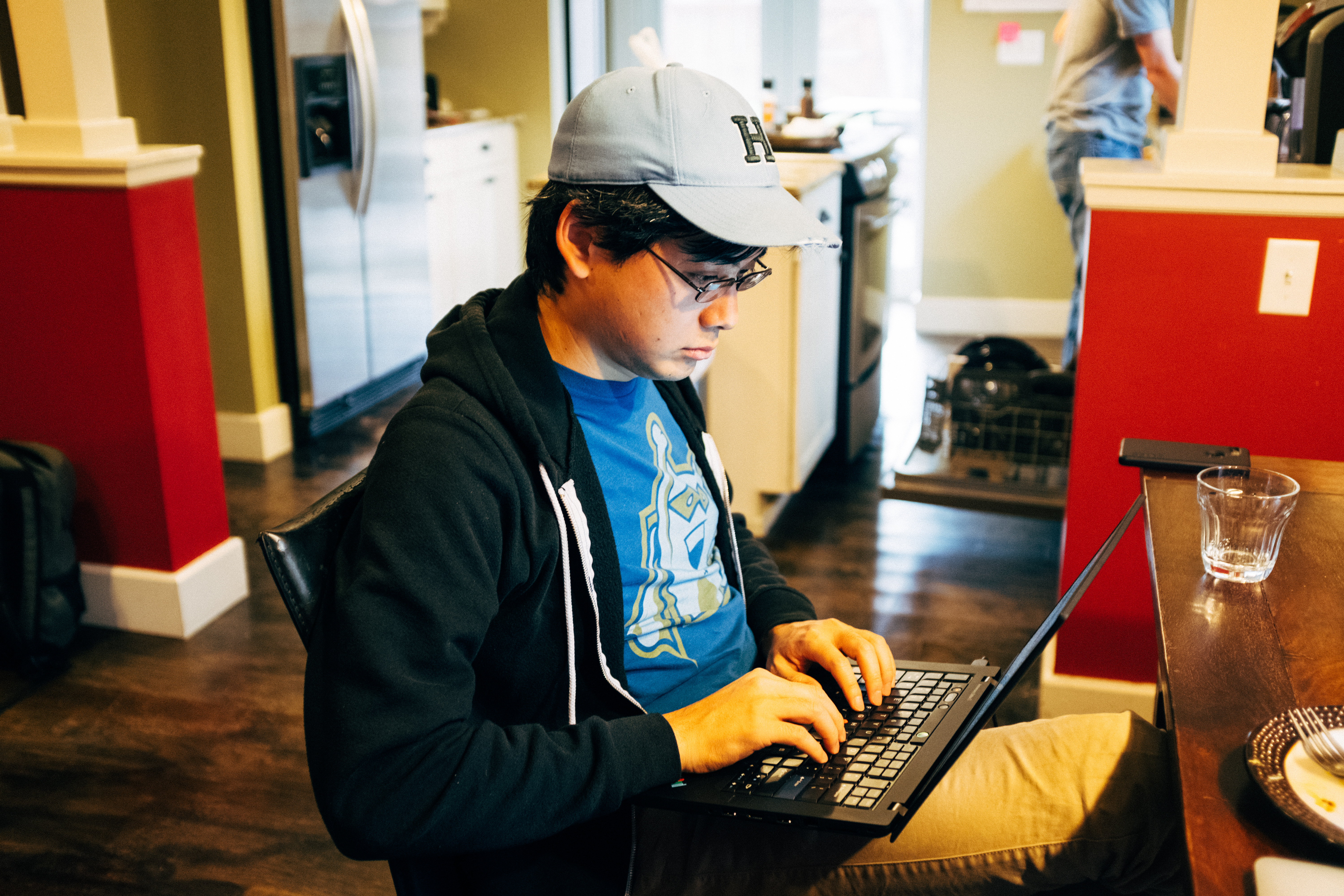 In a warmly lit kitchen, a young man sits intently typing on his laptop, embodying a moment of concentration and creativity. His casual attire and the inviting atmosphere, accented by bold red walls and modern appliances, suggest a blend of relaxation and productivity. The soft lighting enhances the intimate vibe, making it feel like a personal workspace within a bustling home.