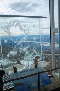 A shattered glass panel stands as a stark reminder of nature's unpredictable forces, framing a breathtaking landscape beyond. The mood is one of somber reflection, accentuated by soft, diffused light filtering through the cracks. Below, informational signage hints at the location's significance, adding depth to the scene.
