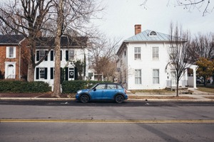 This photograph captures a serene streetscape with two distinct houses standing in stark contrast against a subdued winter sky. A bright blue car sits prominently in the foreground, adding a pop of color to the otherwise muted palette of the surrounding architecture and trees, evoking a sense of quiet charm and everyday life.