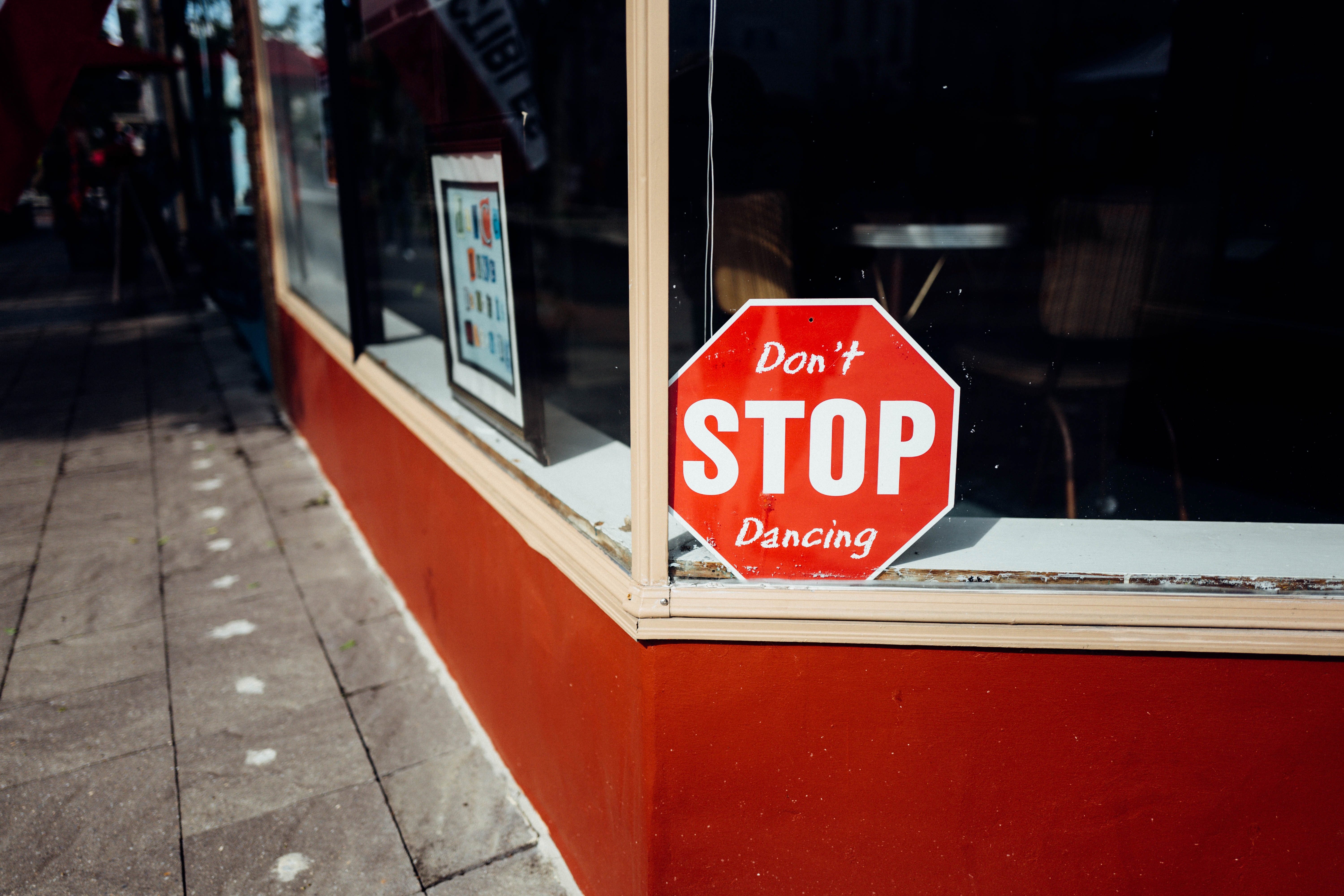 A vibrant red sign boldly proclaims, "Don't STOP Dancing" against the backdrop of a sunlit window, capturing a playful spirit. The composition draws attention with its striking colors and quirky message, inviting passersby to embrace spontaneity. Warm, natural light filters in, casting a cheerful glow that enhances the inviting mood of this urban scene.