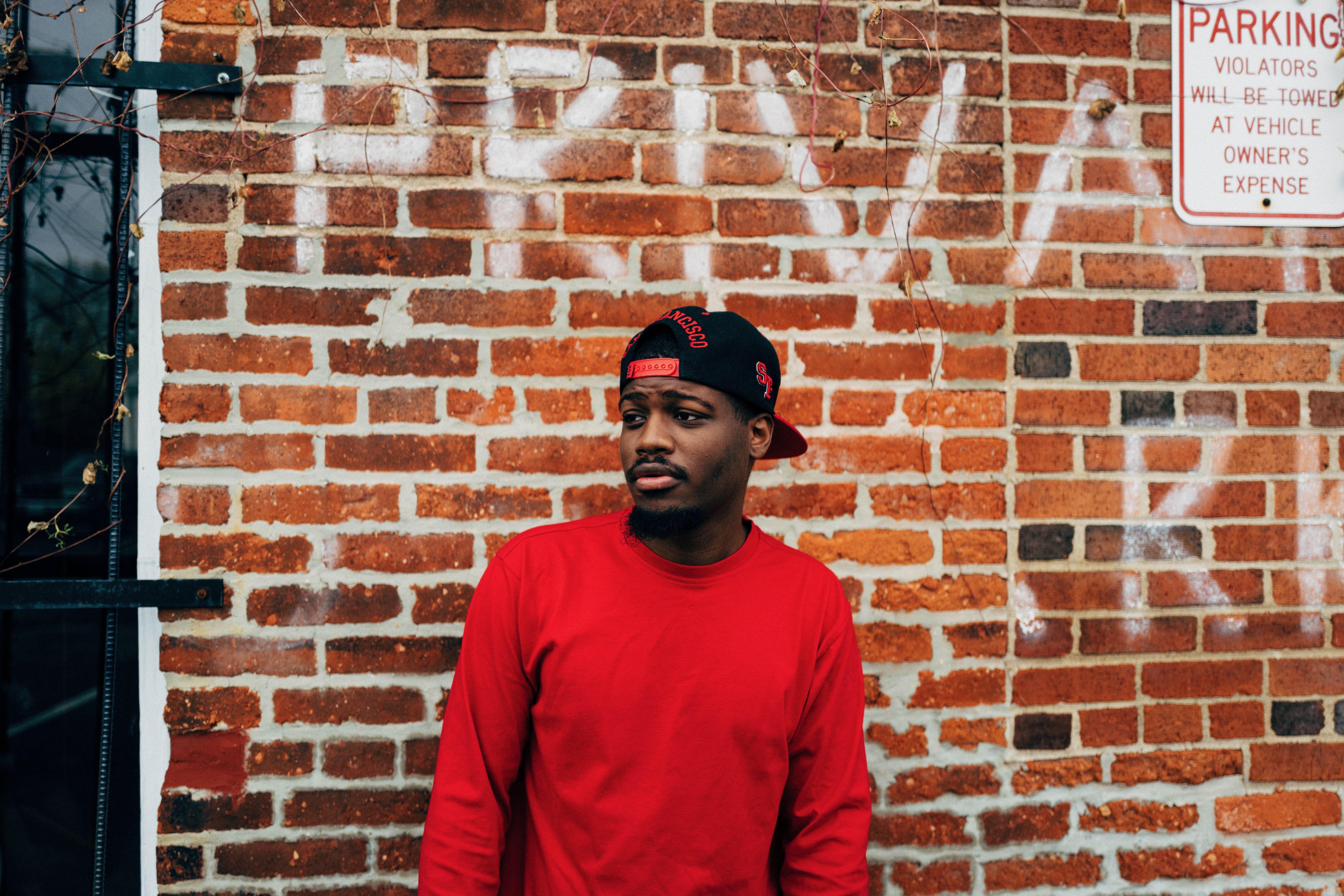 Against a gritty brick wall marked with graffiti, a young man in a vibrant red shirt and black cap gazes thoughtfully to the side. The composition contrasts the warmth of his attire with the cool, muted tones of the brick, creating a mood that is both introspective and urban. Soft, natural light enhances the scene, casting gentle shadows that add depth to his expression.