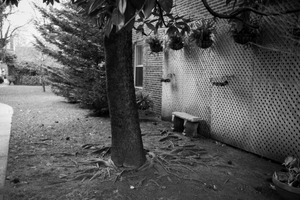 This black-and-white photograph captures a tranquil garden scene, featuring a sturdy tree with visible roots extending into the earth. Soft, diffused lighting creates a serene atmosphere, inviting reflection as a simple stone bench sits nearby, nestled against a textured lattice backdrop. The composition balances natural elements with architectural features, evoking a sense of calm and connection to nature.