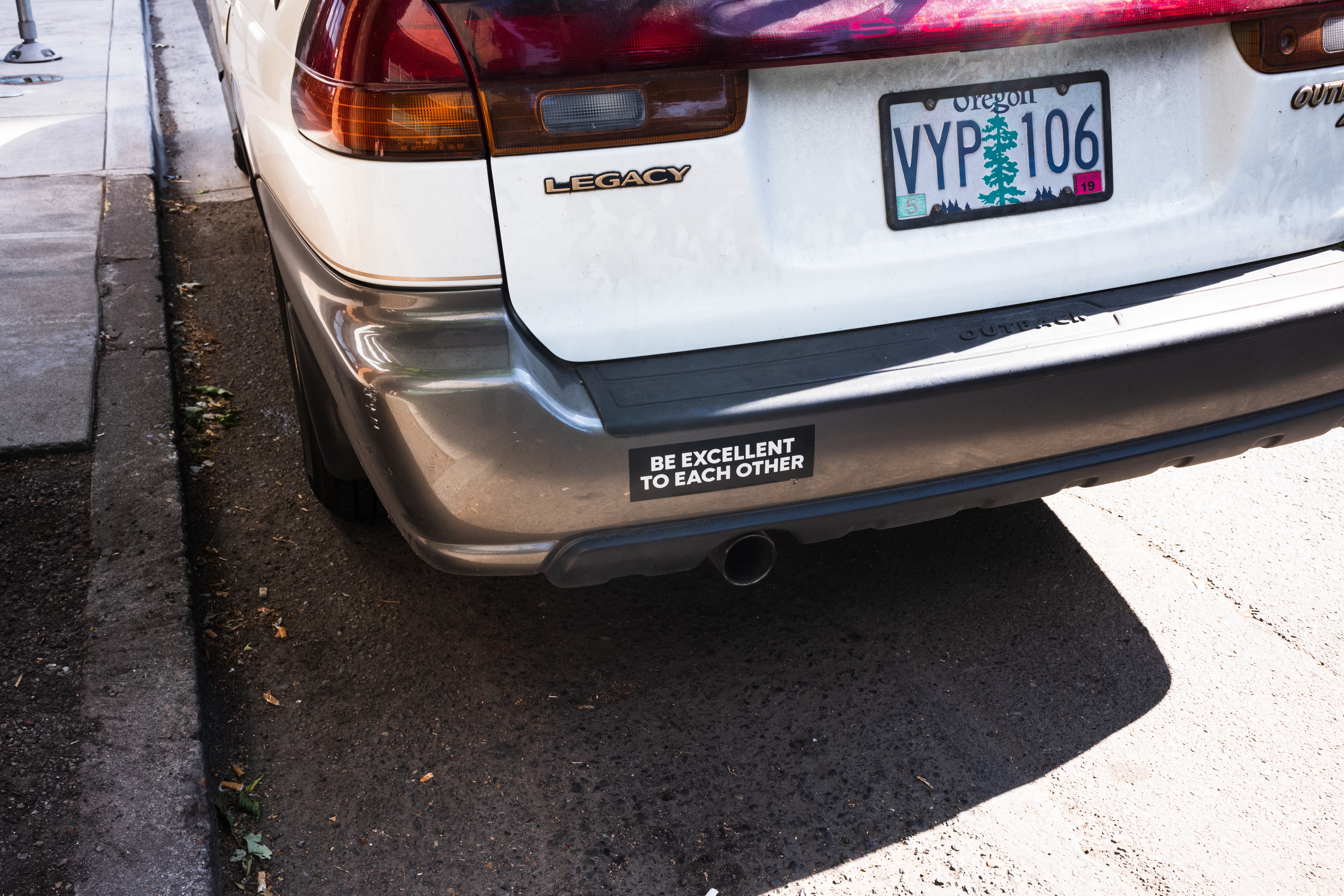 This photograph captures the rear view of a silver Subaru Legacy parked on a sunlit street. A bumper sticker reading 'BE EXCELLENT TO EACH OTHER' adds a whimsical yet earnest touch amidst the otherwise everyday scene, inviting reflection on kindness in an urban setting.