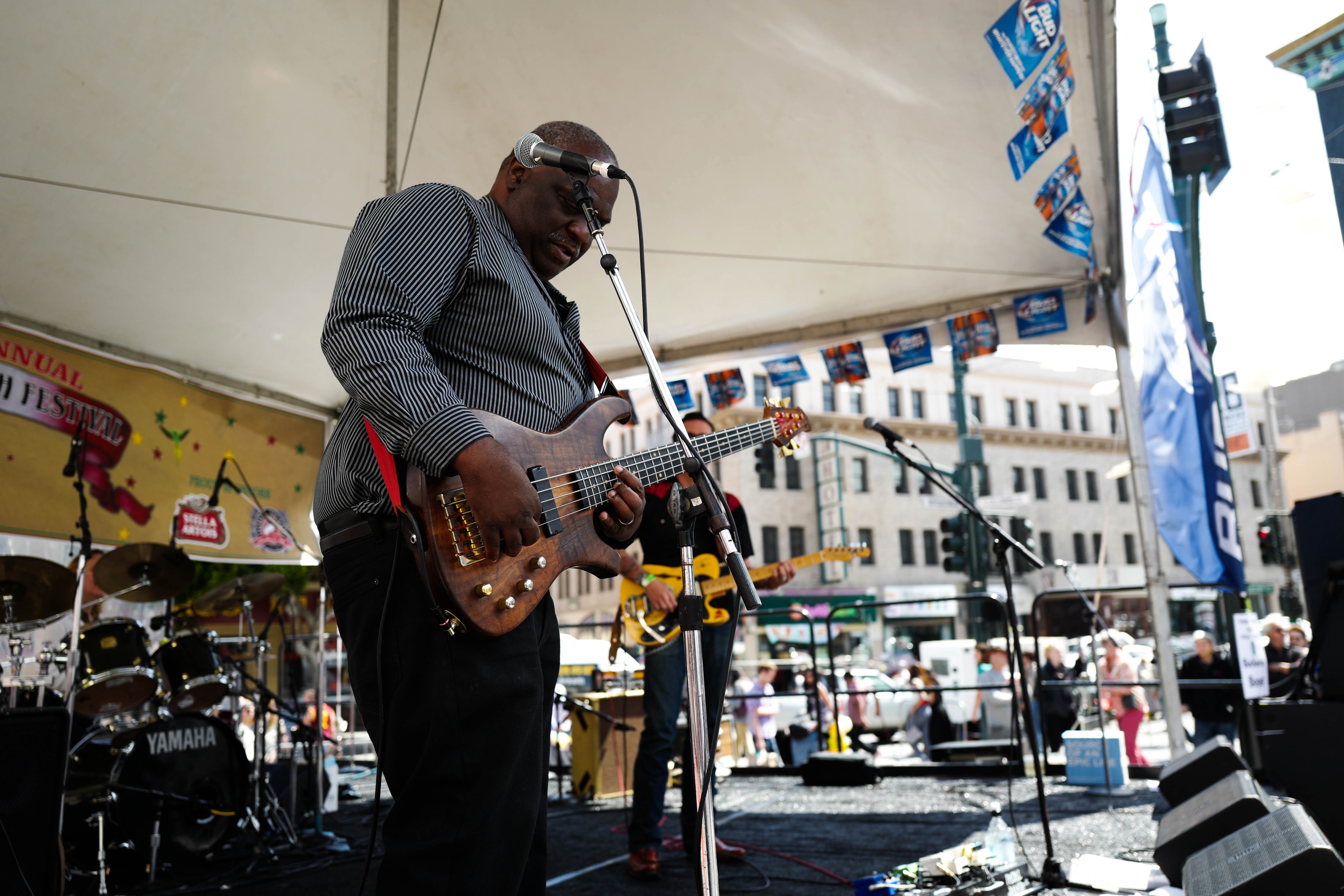 The photograph captures a musician passionately playing the bass guitar under a large tent during a lively festival. Sunlight streams in, illuminating the performer and creating a vibrant atmosphere filled with energy and enthusiasm. The background hints at an engaging crowd and festive decorations, enhancing the celebratory mood.