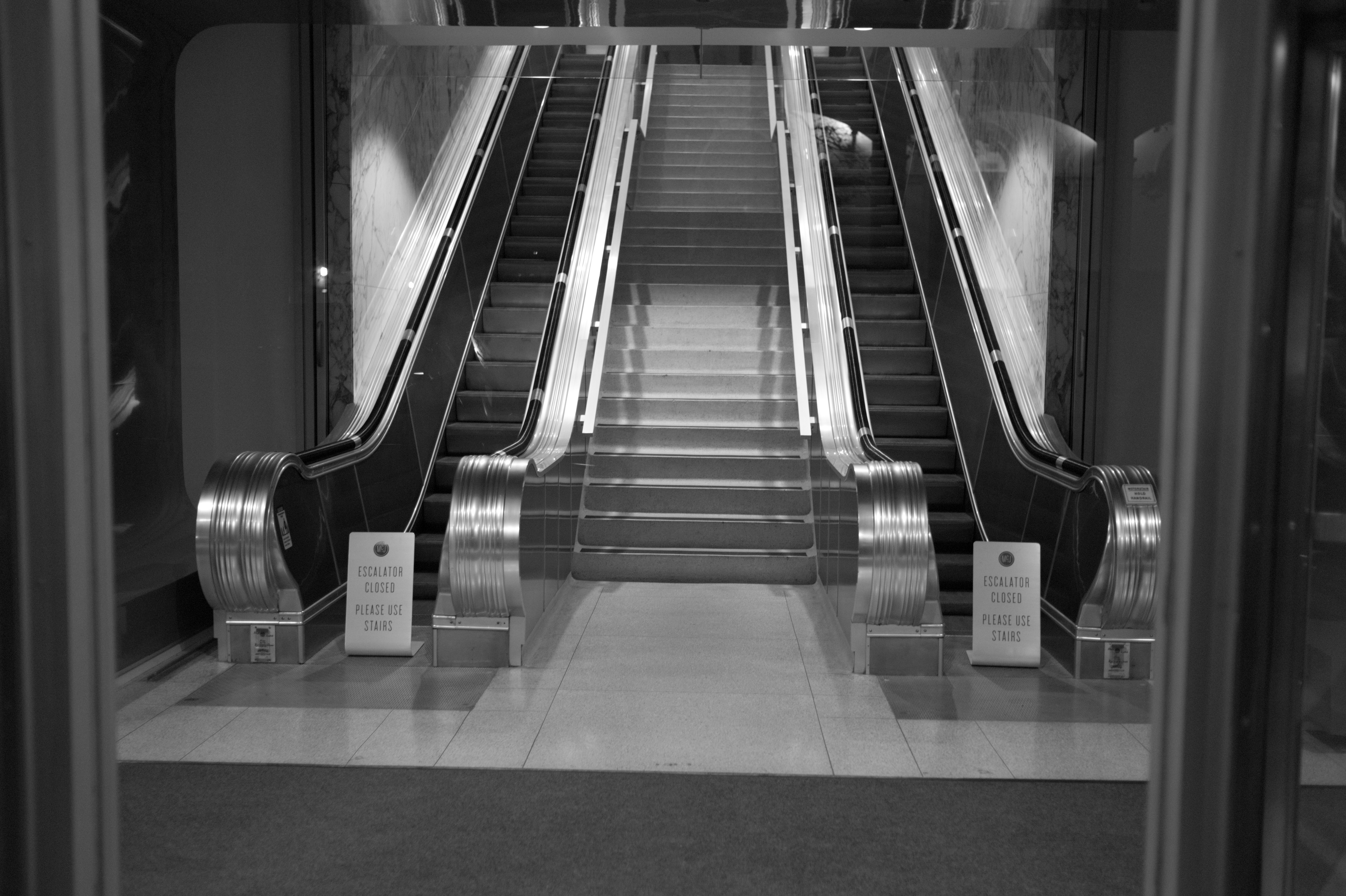 Two escalators lead to an empty staircase, framed by smooth lines and a stark, monochromatic palette. The dim lighting casts soft shadows, creating an atmosphere of quiet solitude and an almost eerie stillness. A sign indicates the escalators are closed, inviting a return to the simplicity of stairs, emphasizing the abandonment of motion in an otherwise bustling space.