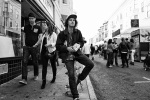 In this black-and-white photograph, a solitary figure leans casually against a fire hydrant, absorbing the bustling street life around him. The juxtaposition of his relaxed demeanor with the vibrant activity of the festival conveys a sense of reflective solitude amidst the crowd. Soft lighting highlights the textures of the urban environment, emphasizing the contrast between the subject's stillness and the dynamic background.
