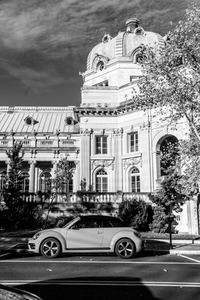 In this striking black-and-white photograph, a sleek modern car is juxtaposed against a grand, classical building, highlighting a clash of eras. Soft, diffused light bathes the scene, casting gentle shadows and accentuating the ornate details of the architecture. The overall mood evokes a sense of nostalgia and sophistication, inviting viewers to ponder the relationship between past and present.