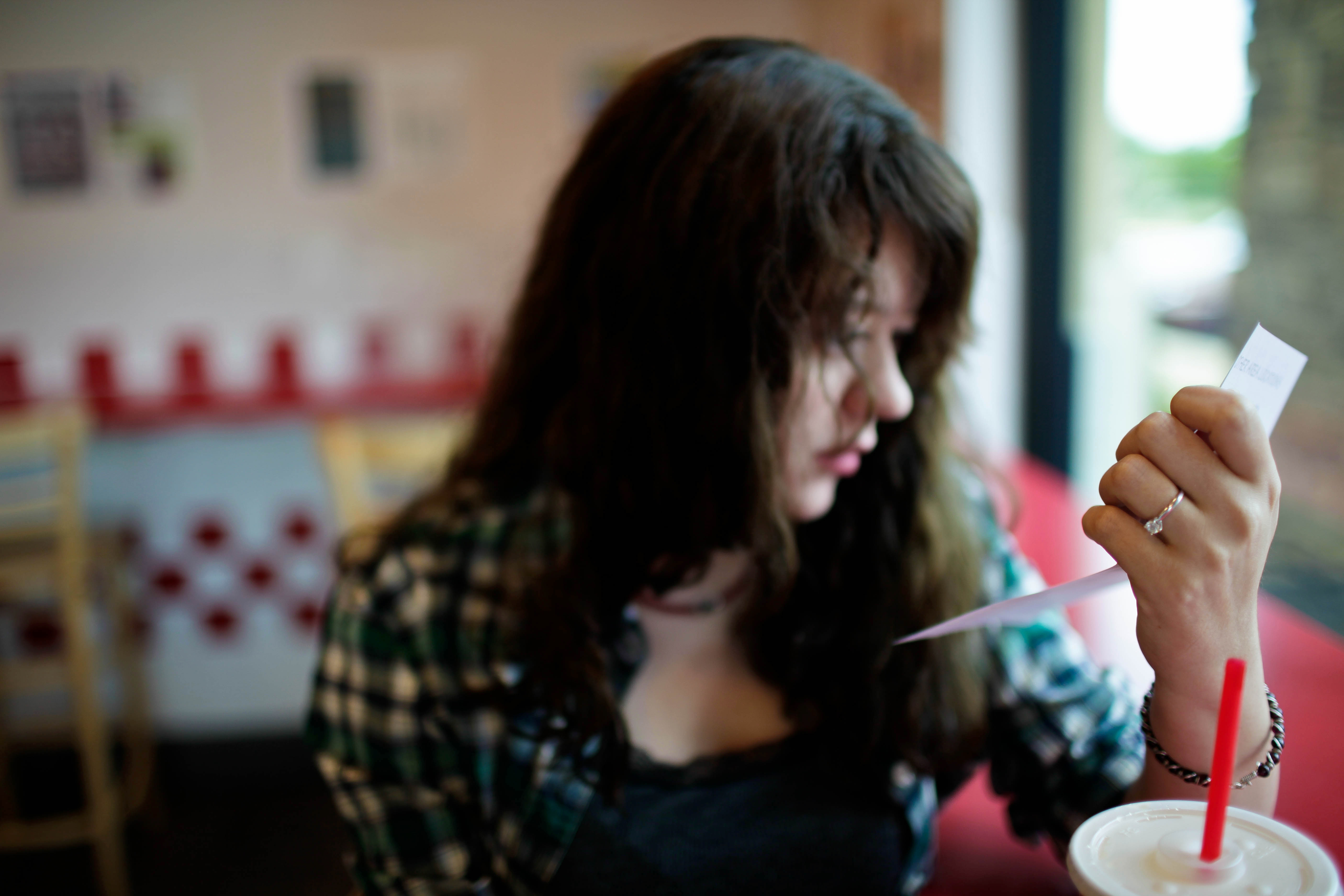 The photograph captures a young woman in a moment of introspection, partially obscured by soft focus that draws the viewer's attention to her thoughtful expression. The warm lighting and casual diner setting create a cozy atmosphere, while the contrast between her plaid shirt and the muted background enhances her presence. Her gaze directed downward, coupled with the slight tilt of her head, evokes a sense of contemplation and curiosity.