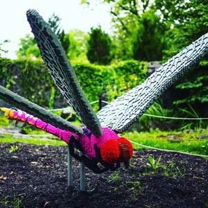 A striking sculpture of a dragonfly created from colorful LEGO bricks, perched on a base in a lush garden setting. The bright pink and red hues of the insect contrast beautifully with the surrounding greenery, evoking a playful yet serene mood. The soft, diffused light enhances the vibrant colors, highlighting the meticulous details of the artistic assembly.