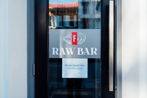 The photograph captures the front door of a Raw Bar, with a notable sign announcing its closure due to a death in the family. Soft sunlight filters through, casting gentle reflections on the glass, enhancing the somber mood of the scene. The composition contrasts a lively establishment with a poignant reminder of loss, evoking a sense of empathy and stillness.